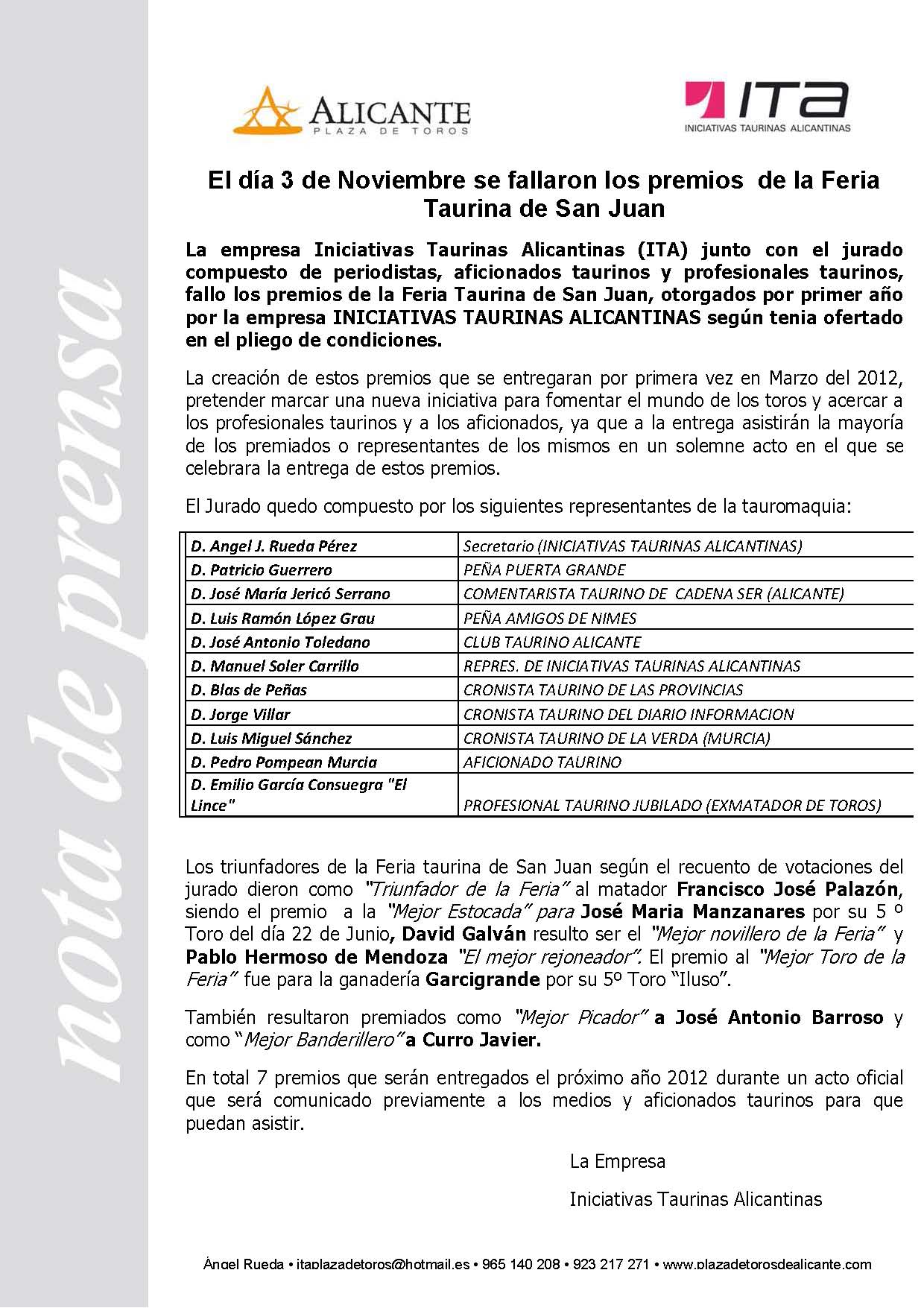 Trofeos de la Feria Taurina de San Juan Alicante 2011 que seran entregados en Marzo del 2012