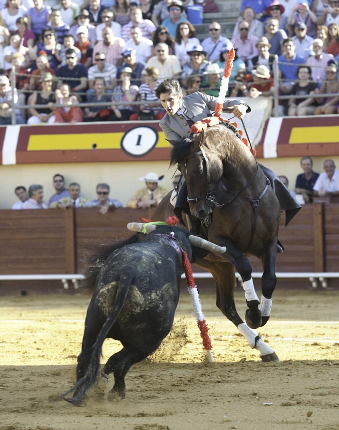 Al primero de la tarde lo paró con Maletilla colocando un rejón de castigo yendo de frente y marcando muy bien los tiempos. En banderillas empezó con Nazarí galopando muy bien de costado y colocando dos palos con gran ajuste, clase y calidad en la ejecución de