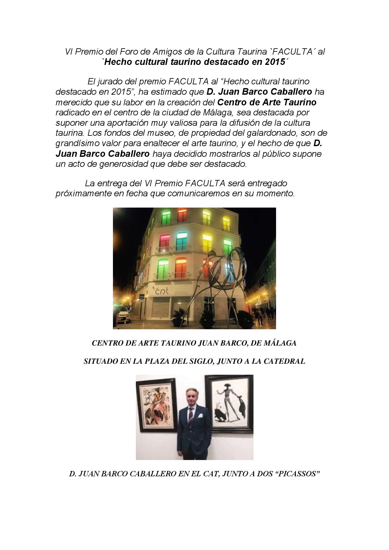 VI Premio del Foro de Amigos de la Cultura Taurina `FACULTA´ al `Hecho cultural taurino destacado en 2015´