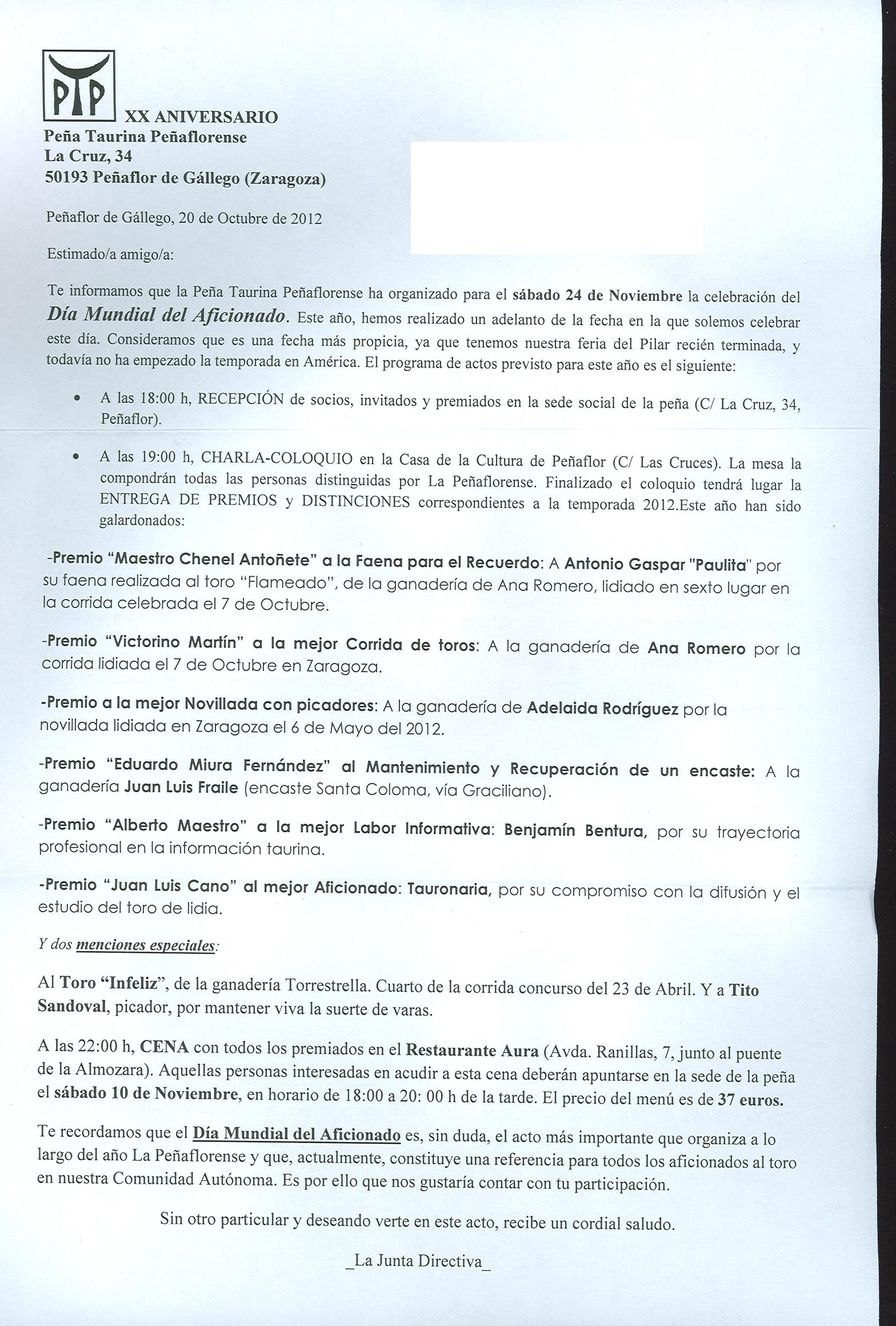 XX Aniversario. Peña Taurina Peñaflorense
